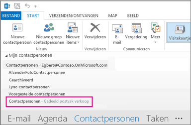 Nadat de beheerder u heeft toegevoegd als lid van een gedeeld postvak, sluit u af en start u Outlook opnieuw. De gedeelde lijst met contactpersonen die is gekoppeld aan het gedeelde postvak wordt automatisch toegevoegd aan de lijst Mijn contactpersonen.