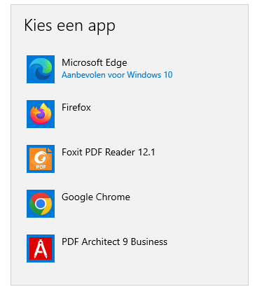 Als je .pdf files direct in je browser wil openen, moet je hier de juiste browser kiezen (voor zover die al niet hier ingesteld zou zijn) waarmee je standaard werkt en bijvoorbeeld Elements opent (MS Edge, Firefox of Google Chrome) Als je echter wil dat bestanden eerst worden gedownload en vervolgens met een PDF reader worden geopend, kies dan voor Foxit PDF of PDF Architect)