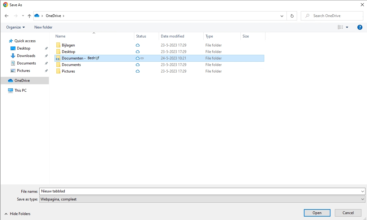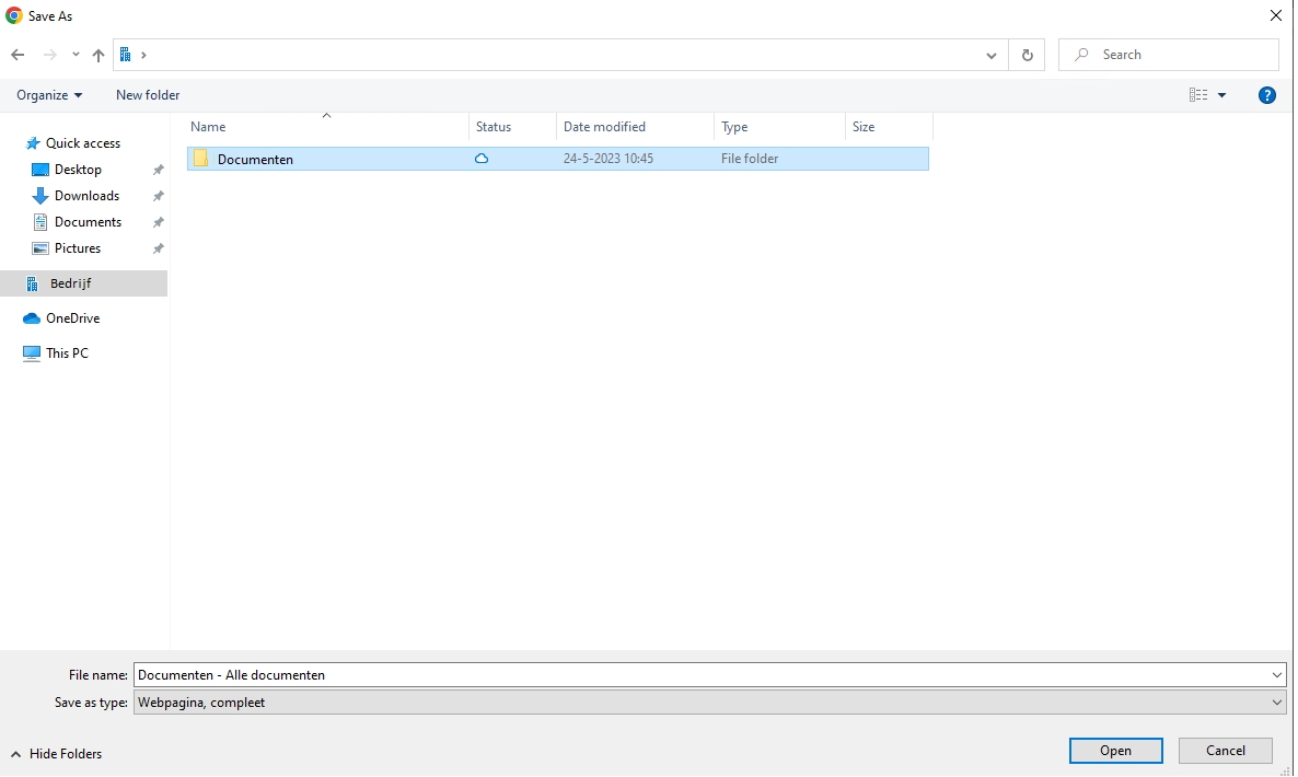 Bij het "Opslaan als" scherm kies je voor "BEDRIJF" of voor de map "OneDrive --> BEDRIJF - Documenten", afhankelijk van hoe je deze hebt gekoppeld in het vorige hoofdstuk.